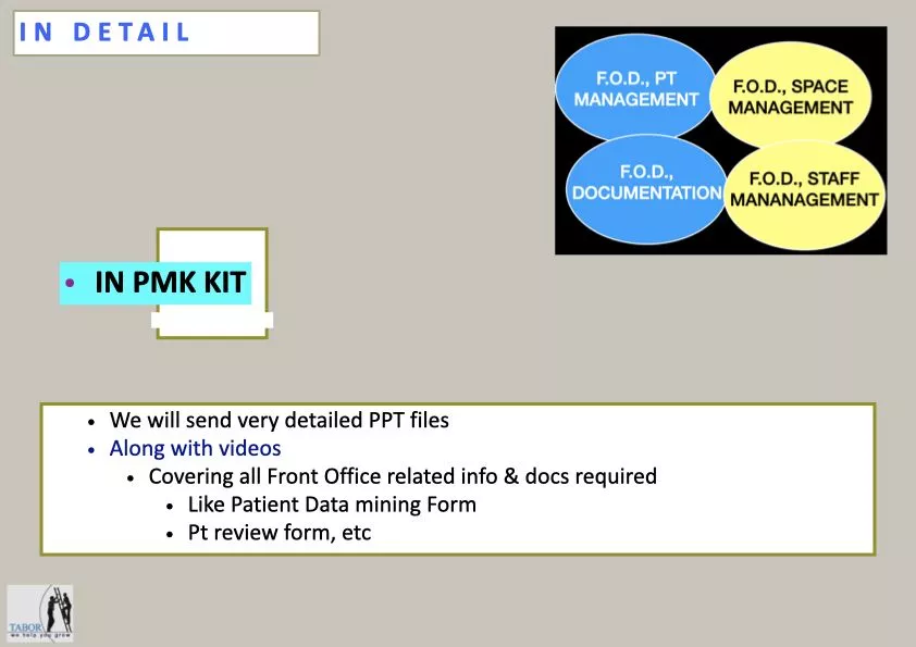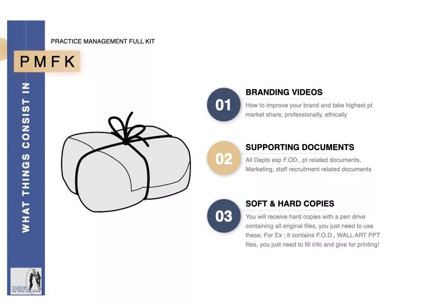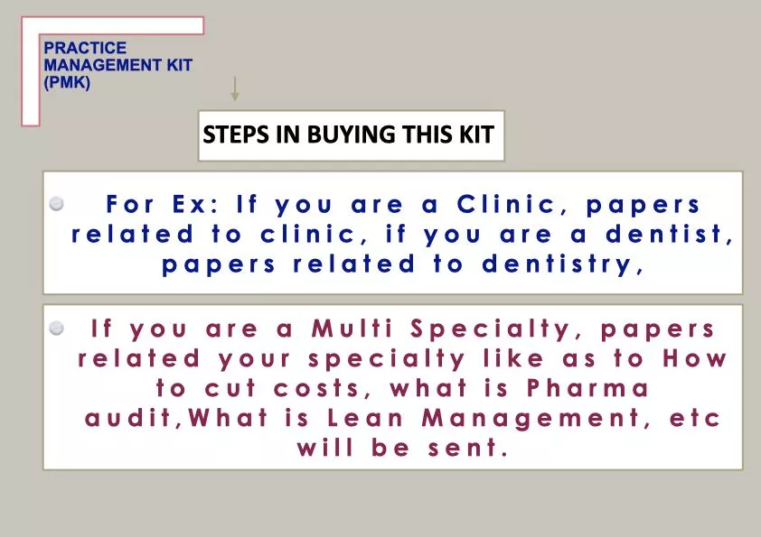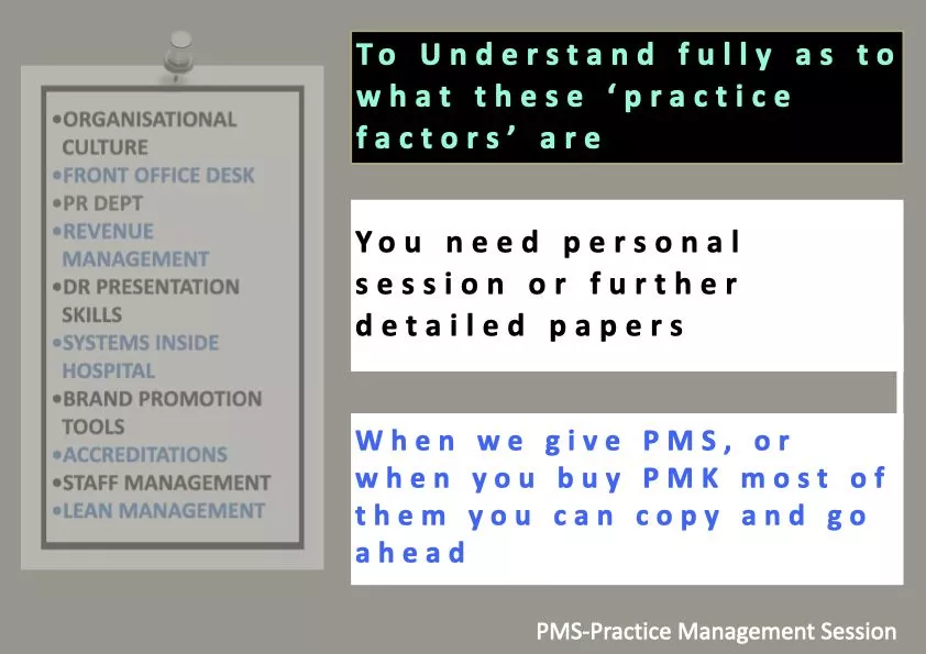 Very detailed practice management kit specially tailor-made for doctors to help them increase knowledge on brand management (administration) & marketing of their practice. Here in PMK, we have very carefully made full PPT presentations along with videos for you to know deeply what practice management is.